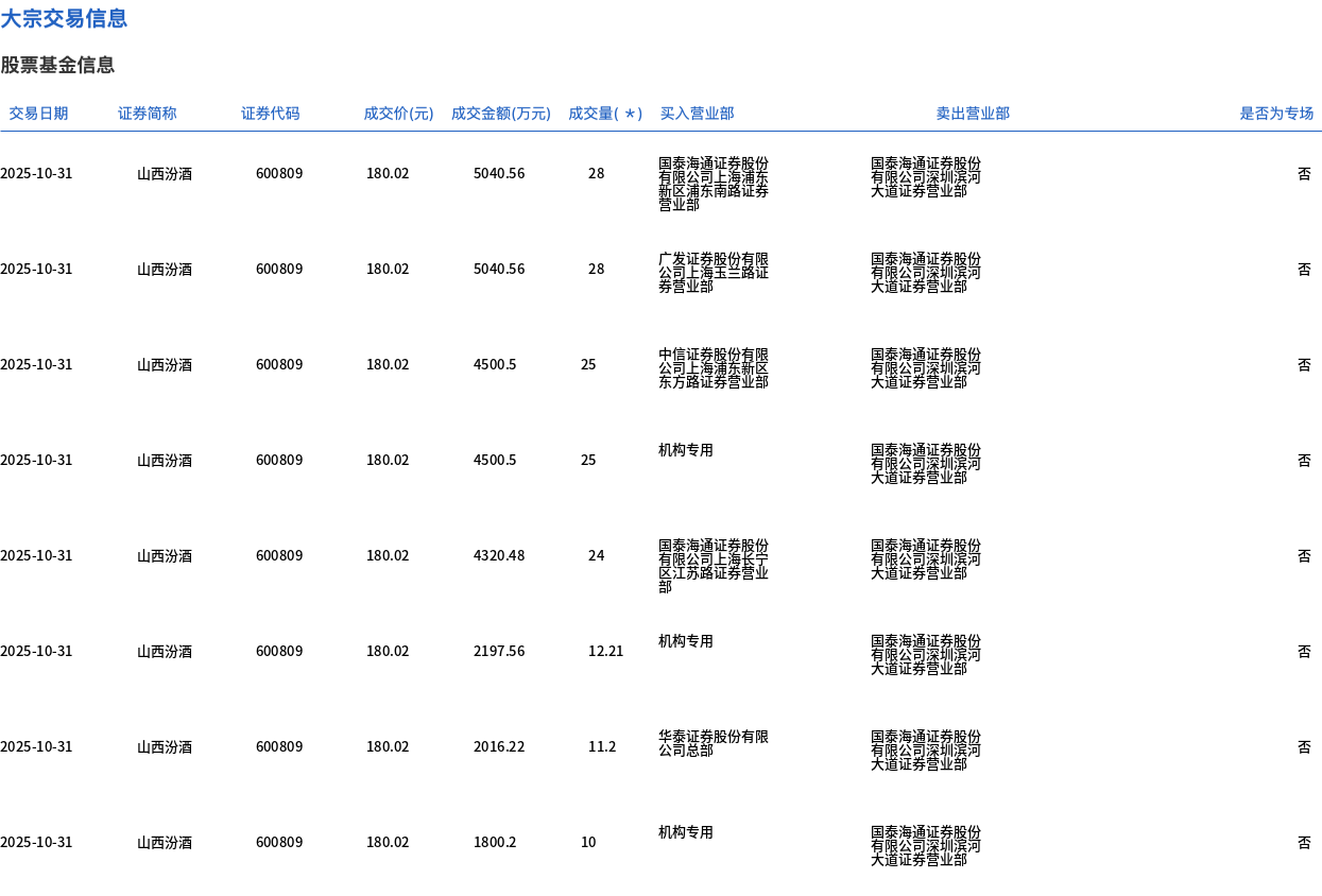 10月31日,山西汾酒大宗交易成交163.41万股,成交额2.94亿元,占当日总成交额的13.98%,成交价180.02元,较市场收盘价190.5元折价5.5%。